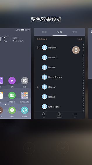 以前的随变功能启动后可以提特效、字体、墙纸等等设置的快捷方式,Amigo3.1系统的随变功能可以通过摄像头拍摄根据环境得出的颜色方面进行桌面、主题、系统主色调的变换,更为人性化。