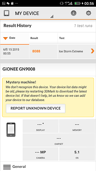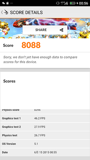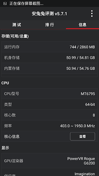通过安兔兔测试可以看到金立E8采用最新的MT6795八核64位处理器,这颗处理器拥有8个A53核心,核心频率为2GHz。另外金立M5拥有3GB的内存和64GB的储存空间,也是现在主流高端的配置。