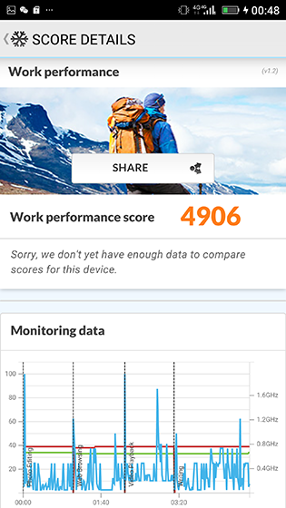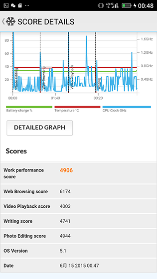 PCmark测试是一个模拟日常操作的系统测试,可以看到金立E8的PCmark得分是4906分,接近5千分的成绩,分数非常高。