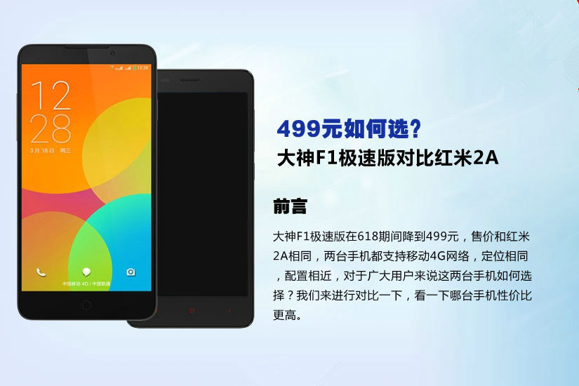 大神F1极速版在618期间降到499元,售价和红米2A相同,两台手机都支持4G网络,定位相同,配置相近,对于广大用户来说这两台手机图和选择呢?我们下面就来进行对比,看哪台手机性价比更高。