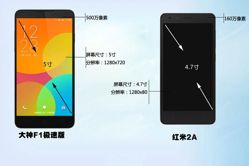 大神F1极速版屏幕为5英寸,分辨率为1280x720,而红米2A版屏幕尺寸为4.7英寸,分辨率为1280x720,明显大神F1极速版的屏幕更大。