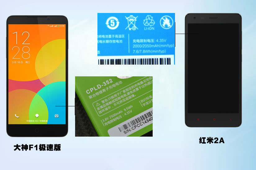 大神F1极速版采用2500毫安电池,红米2A采用2000毫安电池,大神F1极速版的电池容量更大一些,实际使用中两台手机的续航时间大神F1极速版更长一些。