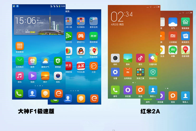 大神F1极速版采用的是Cool UI 5.7,红米2A采用的是MIUI V6,两个系统各有千秋,实际操作体验也是非常出色。