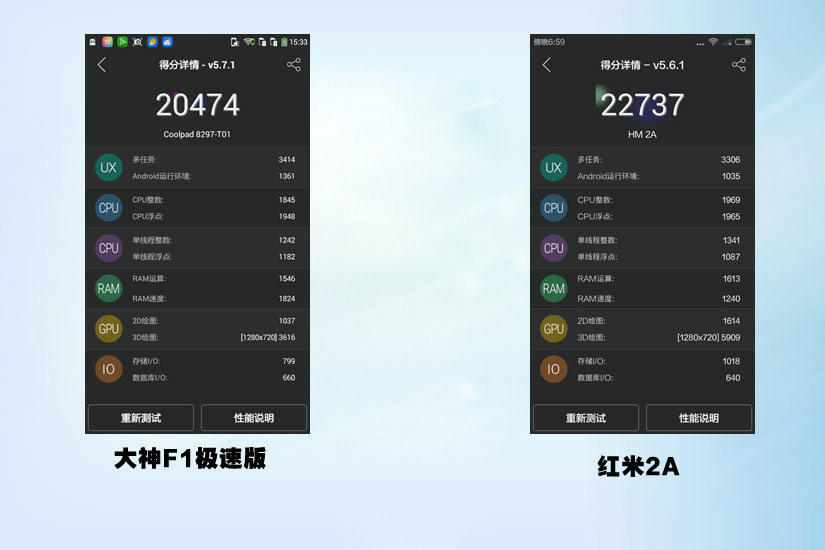 性能方面大神F1极速版安兔兔跑分是20474,红米2A跑分有22733分,跑分上红米2A优胜,但是大神F1极速版拥有2G内存以及64位CPU,未来安卓5.0性能将会有更大的提升。