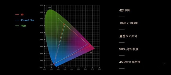 努比亚Z9采用5.2英寸屏幕设计,屏幕尺寸要比努比亚Z9 Max略小一些,分辨率为1920*1080像素,PPI为424,色彩饱和度达到了90%,而据官方介绍,nubia Z9的屏幕显示效果是完全可以秒掉iPhone 6 Plus的屏幕显示效果,下面是色域图: