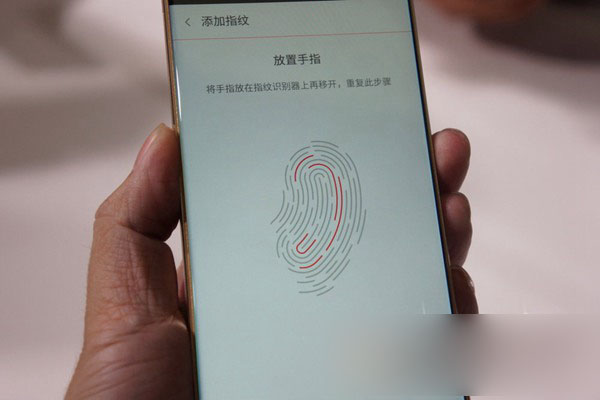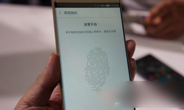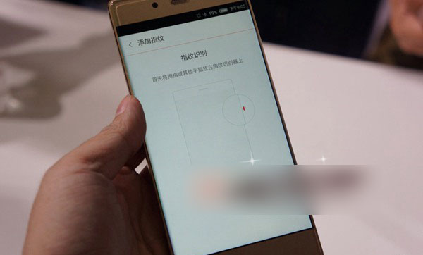 然后进行指纹识别设置,方法很简单(经过对比,小编发现其操作方法和魅族MX4 Pro的设置方法十分类似),然后点击”添加指纹“界面,将拇指或其他手指放在指纹识别键上,也就是机身侧面的实体键,然后慢慢的调整手势,大概只需10秒左右的时间即可完成指纹录入工作,如下图所示: