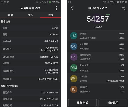 通过最新版安兔兔V5.7跑分软件测试后,我们可以看出努比亚Z9安兔兔跑分为54257分分,超过了5.4万分,超过了目前市场上大多数旗舰产品,对于大型的3D视频和大型游戏足以应对,无需担心卡顿问题。如下图所示: