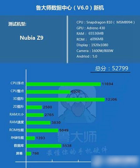另外,我们通过鲁大师跑分软件测试,可以看出努比亚Z9鲁大师跑分为52799分,CPU和3D图形测试结果比较理想,如下图所示: