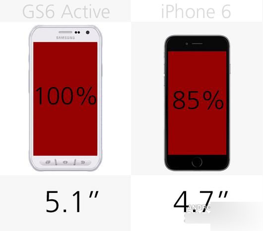 iPhone 6 Plus拥有更大的5.5英寸屏幕,Galaxy S6 Active则为5.1英寸,要比4.7英寸iPhone 6大18%。