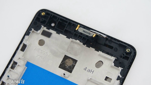 接下来我们就具体来看看中兴V5 Max内部拆机拆解了。取出电池后,我们会发现中兴V5max蓝色的中框非常抢眼球,这也代表着他有着完美的中兴血统,至于是否延续着中兴的良好做工和严格品控,接下来就是需要拆解中兴V5 Max内部的固定螺丝了,中兴V5 Max内部采用固定的螺丝是目前国产手机里不常见的六角梅花固定,拆解上还是比较困难的。