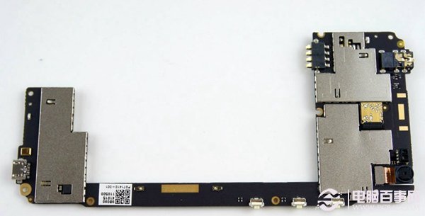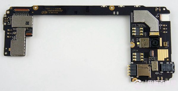 中兴V5 Max的主板采用少有的C型结构,可以避免使用同轴线传输的麻烦。零件的空间还是比较充裕的,毕竟是双面贴片,并且手机屏幕也拥有5.5英寸大屏。如下图所示: