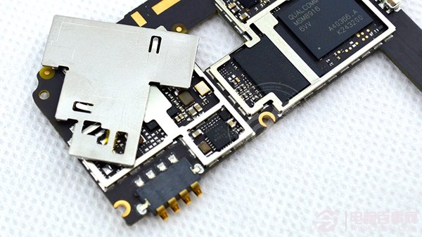 打开金属罩我们可以看到芯片密密麻麻地排列在一起,对于寸土寸金的手机内部空进来说,高度集成已经成为了主流,如下图所示。