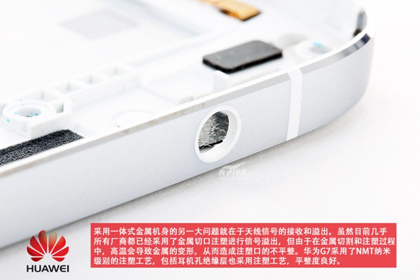另外,采用一体式金属机身的另外一大问题就在于天线信号的接收和溢出。虽然目前机会所有尝试都已经采用金属切口注塑进行信号溢出,但由于在金属切割和注塑过程中,高温会带着金属的变形,从而造成注塑口的不平整。华为G7采用了NTM纳米级别的注塑工艺,抱愧耳机绝缘层也采用注塑工艺,平整度良好。