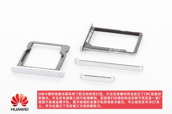 SIM卡槽和按键也偶采用了航空铝材质打造,并且在按键四周也经过CNC高速切削抛光,并且在电源键赏进行纹理雕刻。前面我们所提到的哪些细节其实是一家厂商能不能做金属手机,能不能做好金属手机的很多关键点。从华为G7的做工上看,华为还是具备很强的硬实力的。