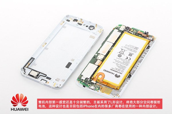 华为G7整机内部第一感觉还是十分规整的,主板采用了L形设计,将绝大部分空间都留给了电池,这种设计也是目前包括iPhone在内的很多厂商都在使用的一种内部设计。