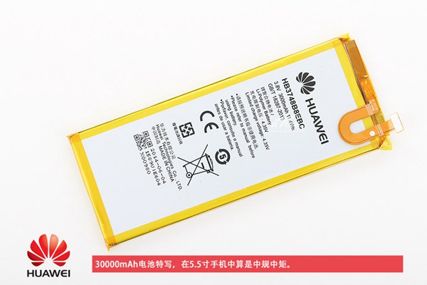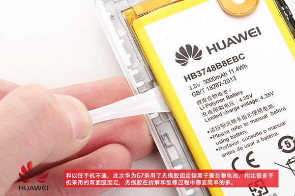 图为拆解下来的华为G7内部的3000mAh容量电池特色,在5.5英寸手机中,也算是中规中矩了。