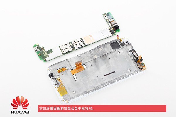图为拆卸下来的华为G7全部屏幕面板和镁铝合金中框特写。