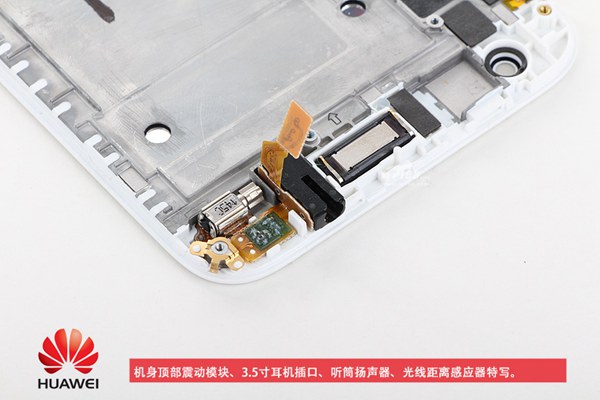 图为华为G7机身顶部的震动模块特色,顶部还有3.5mm耳机插口、听筒扬声器、光线距离感应器等等。