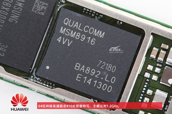 最后我们再来看看华为G7内部主板上中所继承的核心特新。下图为64位高通410四核处理器芯片特写,其主频为1.2Ghz。