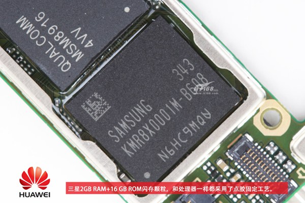 图为三星2GB RAM + 16GB ROM闪讯颗粒芯片,和处理器一样都采用点胶固定工艺。