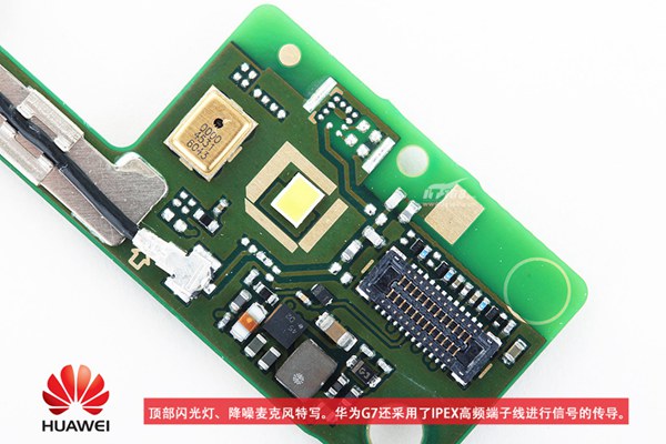图为华为G7顶部闪光灯、降噪麦克风特写。华为G7采用了IPEX高频端子线进行信号的传导。