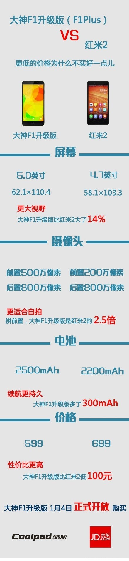 酷派大神F1升级售价599元,并在京东开放购买无须预订,比红米2便宜了一百块。