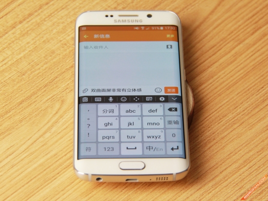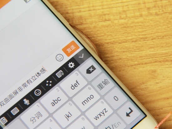 虽然曲面屏幕能够带来立体的视觉效果,但是曲面屏幕也并非没有缺点,上述的图片中相信各位已经看到了,在界面的边缘(例如输入法界面中的退格X键,有约1/4的面积是浸在曲边上的,所以可触控的区域只有原面积大小的3/4)