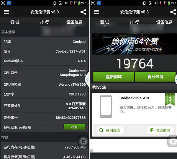 在进行测试之前,我们还是再来看看大神F1 Plus配置,该机采用1.2Ghz高通410四核处理器,基于64位处理器,运行1GB RAM内存,而上一代大神F1,搭载了1.7Ghz联科发MT6592八核处理器,运行2G内存,从硬件配置上看,大神F1 Plus明显有些缩水,那么这款手机跑分如何呢?且看安兔兔5.3跑分成绩。