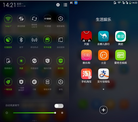 系统方面,大神F1 Plus运行基于基于Android OS 4.4内核的最新CoolLife UI 5.7 界面,CoolLife UI 界面如今可以说已经十分成熟。最新的Cool UI 5.7取消了二级菜单让整个系统更为简约,整体UI界面风格给人一种时尚大气质感,而手势唤醒、智能多屏、浮动C键的加入,使其操作更加便捷,下面我们简单介绍下大神F1 Plus系统体验。