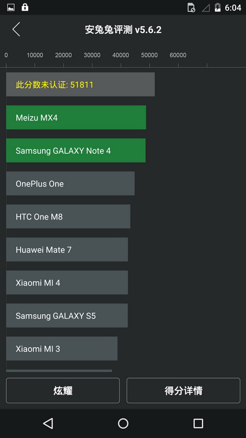 Moto X Pro的跑分成绩不太稳定,时而46000多时而破5万,最后两次测试都超过了51000,最终选取了51811的成绩,毕竟骁龙805还是比骁龙801强悍的。而小米Note则表现的很稳定,一直是46000多分。