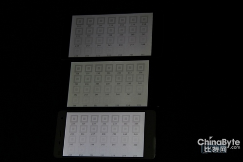 在黑色饱和度测试中U3可以完美显示到3的阶段,小米4和一加都在6、7之间,0—6阶显示不够完整。