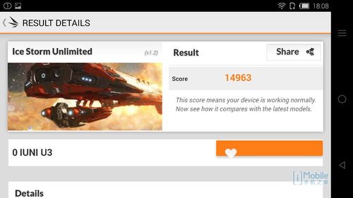 GPU方面,测试采用3DMark中的Ice Storm Unlimited环节,最大程度的比较手机整体原始性能,以及不受垂直同步、显示分辨率缩放和其它系统因素的影响。在这项测试中小米4以超过2万分的成绩领先,当然U3因为2K屏幕的缘故在分数上没有那么好看,但是相对同样搭载2K屏幕的G3还是略有优势的。