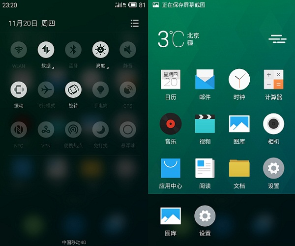 此外,Flyme 4.1也拥有常见的上拉菜单快捷操作和后台管理操作,一些常用的设置开关均位于顶部的下拉菜单中,底部还有后台管理便携菜单,操作上非常方便,如下图所示。