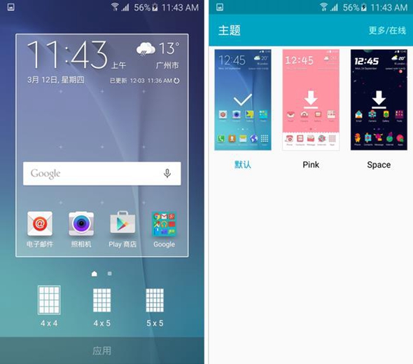 长按主屏呼出编辑窗口,新TouchWiz提供控件、墙纸、网格、主题等四种个性化设置选项。其中比较有用的是网格与主题,网格可以调节主屏上图标的大小,你可以选择一页容纳更多图标,也可以选择一页图标少一些更清爽。另外,三星也开设了主题商店,虽然目前内容还不多,但相信过阵子还是会有一定的专题样式可供选择的。