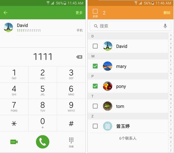 拨号界面变得更加清爽,联系人界面去掉了累赘的上方导航栏,突出了下方联系人信息,支持首字母快速找寻联系人。