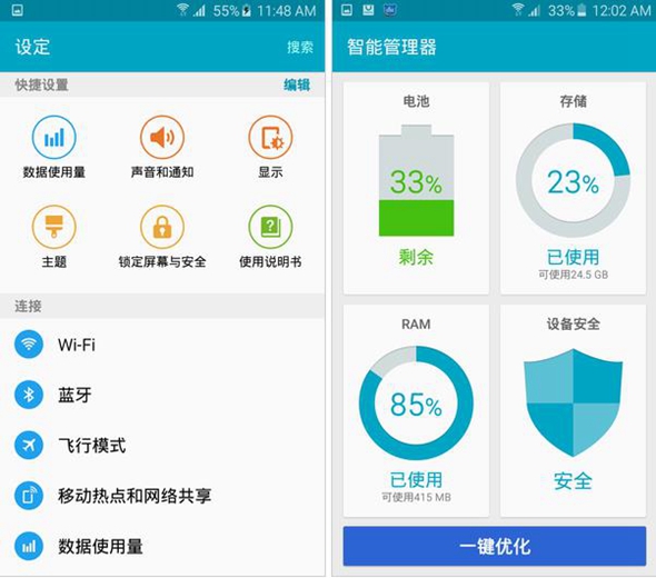 置界面最上方增加了常用快捷设置选项,用户可以将使用频率最高的设置选项放上来,以节省时间。另外,新版设置界面的色彩变得更浅,更加清爽悦目。而且设置项目中还添加了智能管理器这一类似于“360”或“猎豹”的管理类工具。