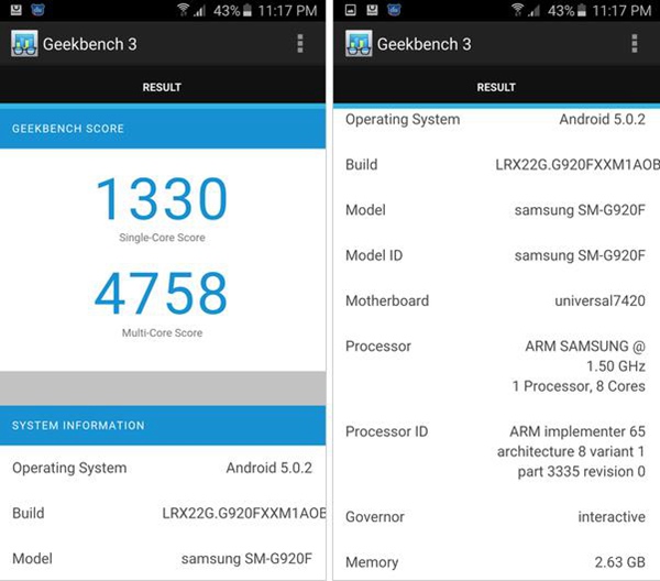 而在跨平台跑分软件GeekBench3上,Galaxy S6也拿到了单核1330分,多核4758分。那iPhone 6跑了多少分呢?结果是单核1633分,多核2923分。虽然Galaxy S6在单核性能上不及iPhone 6,但也是安卓阵营中最高的了。