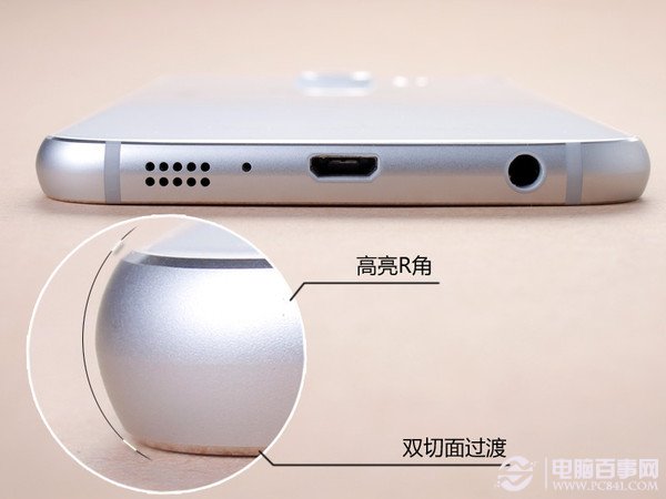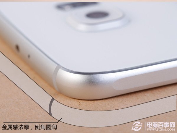 正面仍是经典的三星风格,最大的亮点仍是金属边框,采用目前非常流行的四段式结构,手机顶部配置一枚红外发射装置和一个录音孔,底部配备了3.5mm通用音频接口,Micro-USB充电和数据接口,话筒,以及10孔扬声器。整机厚度控制在了6.8mm(不含摄像头),比iPhone 6还薄0.1mm,比iPhone 6 Plus薄0.3mm。