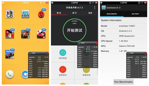 ▲从Smartisan T1开始,老罗就在弱化跑分和内存清理等功能,坚果手机同样不例外,它提供了一个类似黑名单的机制,当检测到跑分软件在前台运行时,骁龙615会直接锁死6核,仅保留两个350MHz的核心,GPU也会被限制在待机状态,此时不用说跑分,就连软件的打开和界面操作都很成问题。