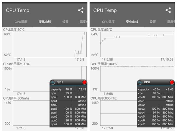 ▲不过,我们手里还是有未被封杀的SoC测试工具,开始对其进行100% CPU负载压力测试后,骁龙615迅速蹿升至60摄氏度附近,此时CPU便会开始进行限制和降频,最终长期稳定在6核、800MHz状态,随着测试时间的延长,温度还会有小幅的、极慢的上升。