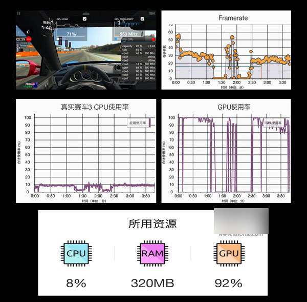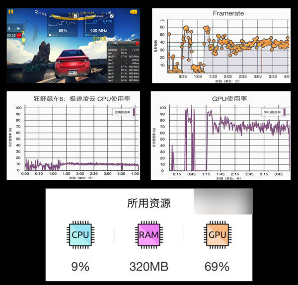 ▲可以自适应画质的《狂野飙车8》表现不错,最低帧率也保持在25帧以上,画面较为流畅,可玩性较高。
