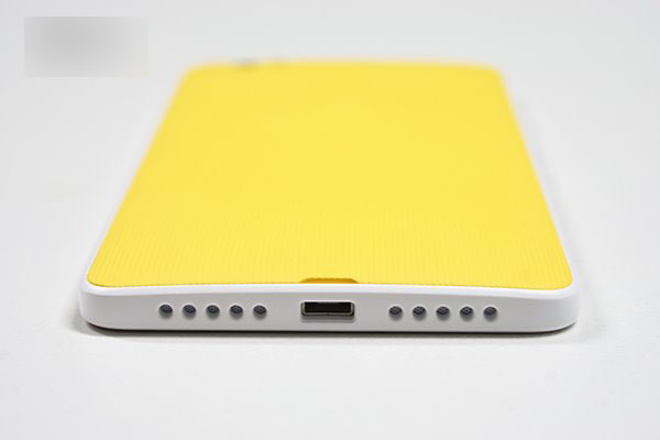 ▼坚果手机机身底部的数据线插孔采用了长方形造型,而不是常见的倒梯形,不仅从外观上来看略显粗糙,实际接入充电/数据线后也很容易产生左右晃动。两侧对称排布的10个开孔中隐藏了坚果手机的听筒和扬声器,当然是单扬声器,不要奢望更多。