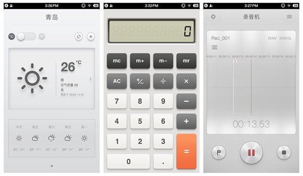 ▲部分系统自带应用,从左到右分别是天气、计算器和录音机。天气界面提供了最基础最需要的信息,其他内容则被放置到二级页面里,需要滑动一次才能看到;