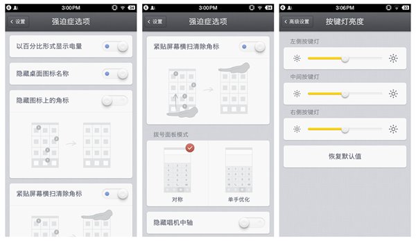 ▲坚果手机设置中带有一个颇为奇葩的“强迫症选项”菜单,里面不仅有看起来相对正常的“以百分比显示电量”、“隐藏桌面图标名称”、“单手拨号面板”等常规功能,还提供了单手清理角标、隐藏音乐播放器中的唱机中轴、单独无级调节每个触摸键亮度等功能......
