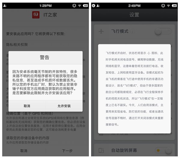 ▲开启允许安装第三方应用以及飞行模式时,Smartisan OS所给出的超长解释说明,浓浓的锤子味。