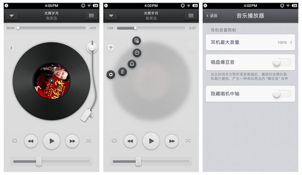 ▲在Smartisan OS中开启唱盘爆豆音后,想安静地单曲循环听一首歌简直是不可能完成的任务,后期会逐渐产生一种类似唱片磨损的杂音,逼着你不得不去换一首歌,点击上方的小雨伞功能,可以快捷开启歌词显示、设为铃声、加入播放列表等功能。直接摆动磁头或者转动盘片都可以产生快进快退的效果,拿开则是暂停播放。