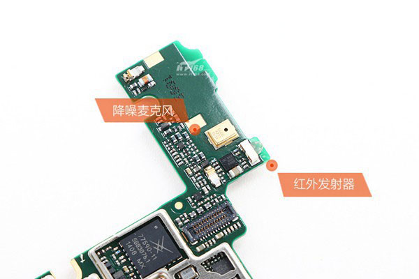 图为L型主板底部的一些细节特写,这里主要看点就是降噪麦克风和红外发射器了,如下图所示。