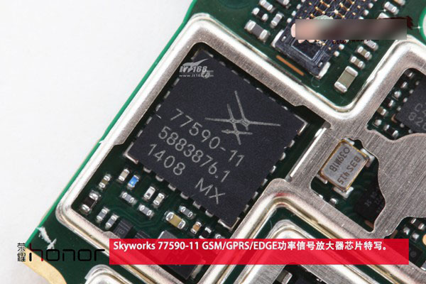下面我们重点来看看主板上的核心芯片,将主板上的屏蔽罩拆卸后,就可以具体的看到内部芯片了。首先我们看到的是Skyworks 77590-11 GSM/GPRS/EDGE功率信号放大器芯片特写。