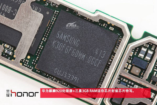 图为华为自主推出的麒麟920处理器+三星3GB RAM运行内存芯片结合封装,其设计方式类似于高通方案。值得一提的是,荣耀6安兔兔跑分号称超4万,是目前安兔兔跑分最高的手机。