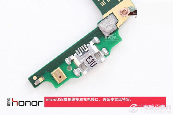 图为荣耀6内部主板底部的microUSB数据线和充电接口以及通话麦克风特写。